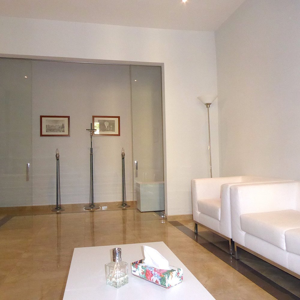 Il nuovo edificio ospitante le cappelle funerarie è attrezzato per ospitare i congiunti in ambienti arredati con gusto e semplicità. Ogni cappella è dotata di due ambienti separati da una parete di cristallo, un salottino privato arredato con confortevoli divani e poltrone, dotato di angolo bar, e vano separato climatizzato per l’esposizione della salma.